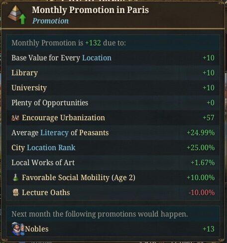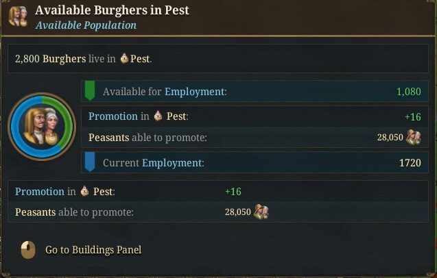 社会階級について言えば、これは人口を分割するカテゴリです。利用可能な職業や需要に応じて、あるポップを昇格 (promote)/降格 (demote) させることが可能です。異なる建物が異なるポップを雇用します。例えば、ブルガー (burghers) や労働者 (laborers) は主に経済活動(物品生産)に従事し、貴族 (nobles) や兵士 (soldiers) は防衛を担い、聖職者 (clergy) は識字 (literacy) を提供します。しかし、属性 (attributes) も重要です。たとえば、より識字率の高い聖職者は、他ポップを改宗 (convert) する能力もより高くなります。