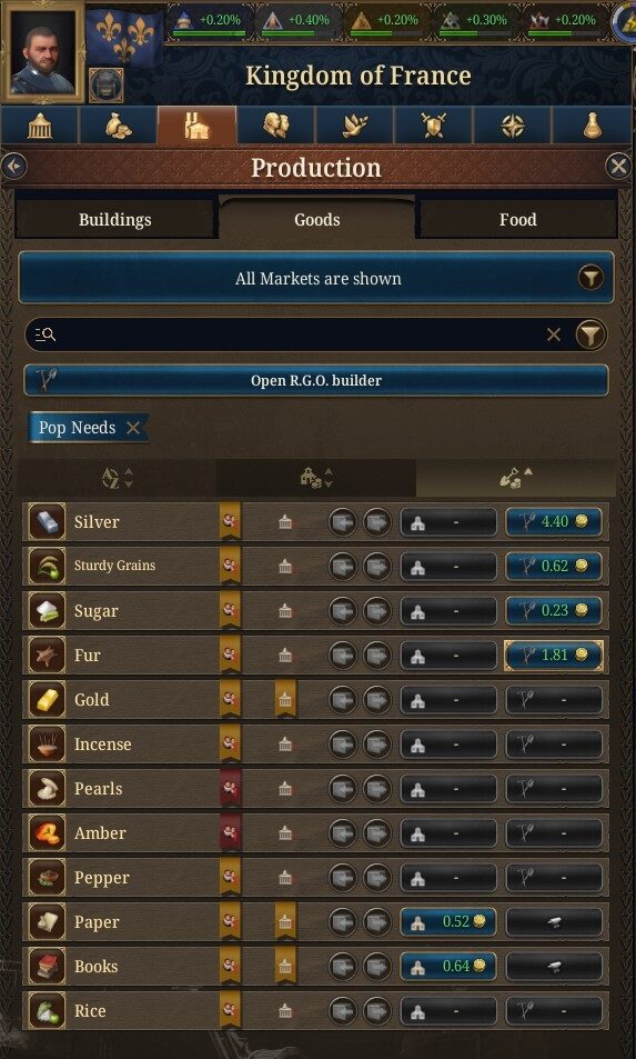 ポップスは、ニーズ (needs) をもち、プレイヤーの政策 (policies) に反応します。ポップには食糧、衣服、嗜好品 (luxuries) といった必需品 (essentials) が必要で、これらは EU5 で改編された交易 (trade) システムに統合されます(これについては後日の開発日誌で詳しく語る予定です)。