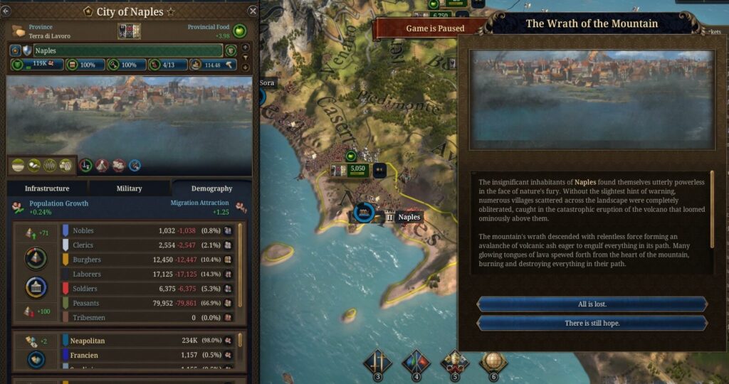 個々のポップを超えて、EU5 の「生きた世界」は動的相互作用 (dynamic interactions) と歴史的イベント (historical events) にも支えられています。たとえば、黒死病 (Black Death) や宗教改革 (Reformation) のような重要な歴史イベントは、“Situations(シチュエーション)” と呼ばれるユニークなメカニクスを引き起こします。例えば、ペスト (bubonic plague) は都市ポップを特に壊滅させる可能性があり、プレイヤーは都市を隔離 (quarantine) するか、貿易収入を犠牲にするかを選択しなければならないでしょう。