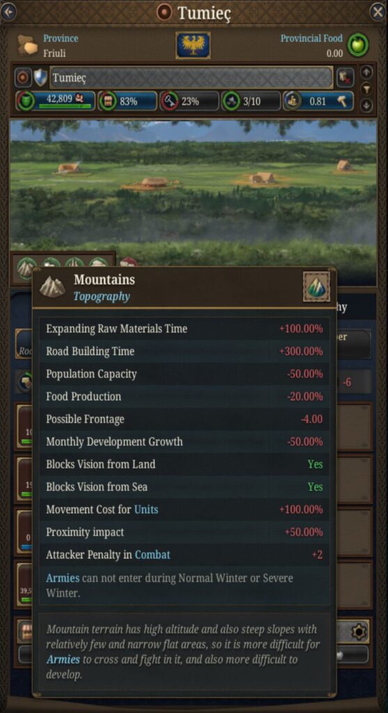 定住地そのものを超えて、地理的特徴 (geographic features) はゲームプレイにおいて極めて重要な役割を果たします。各ロケーションは、気候 (climate)、植生 (vegetation)、地形 (topology) によって定義されます。これら三要素は戦略的選択に直接影響します。たとえば、平野では騎兵 (cavalry) が優勢ですが、丘陵地帯では歩兵 (infantry) が強みを発揮します。