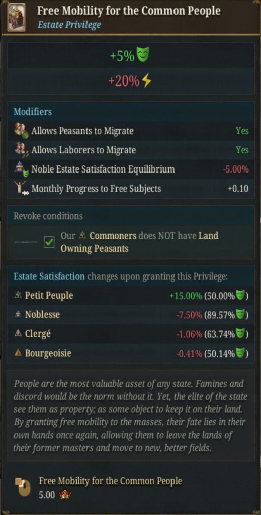 ポップスは EU5 のエステート (estate) システムと密接に関わっています。貴族 (nobles)、聖職者 (clergy)、ブルガー (burghers)、庶民 (commoners) の各エステートは、それぞれ独自の野望 (ambitions) と特権 (privileges) を持っています。特権を与えることは、複数のエステートに影響することがよくあります。例えば、貴族に農奴権 (serfdom rights) を認めれば、農民ポップの幸福 (happiness) は低下し、貴族の忠誠 (loyalty) は高まる、というようなバランスです。逆に、庶民を解放すれば経済成長を促せますが、エリート層 (elites) を怒らせる可能性もあります。