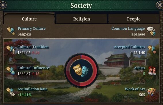 この複雑なシステムにより、すべての国がユニークに感じられるようになります。例えば、多文化国家であるオスマン帝国 (Ottomans) を統治するのと、より文化的に均質な足利将軍家 (Ashikaga Shogunate) を管理するのとでは、まったく異なる経験になるはずです。