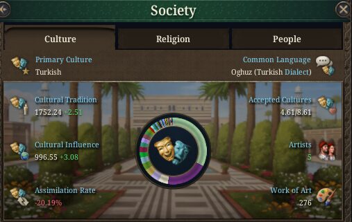各ポップには、所属する文化 (culture) や宗教 (religious beliefs) が割り当てられており、それによって多様な住民構成がほぼすべての場所で存在します。数百もの宗教、数千もの文化がゲームに登場し、完全に均質な人口構成が起こることは稀です。文化や宗教は単なる見た目 (コスメティック) にとどまりません。文化的威信 (cultural prestige)、技術的進歩 (available advances)、さまざまな挙動、そして識字率 (literacy) に直接影響します。