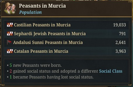 例えば、イベリア地方のある地で、単一の社会階級(たとえば農民階級)が住んでいたとしても、そこにはカタルーニャのカトリック、アンダルシアのスンニ派、セファルディ系ユダヤ教徒など、複数の文化・宗教グループが混在する可能性があります。プレイヤーは、こうした多様な人口の欲求と要求をどう調整するかを決めなければなりません。同時に、政治・文化・宗教の違いによる摩擦も管理しなければならないのです。