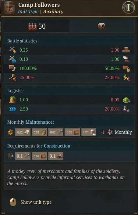 しかし、これほど多くの兵を伴うには、軍を支える補助連隊――すなわち後方支援部隊――に依存する必要があります。たとえば、ゲーム序盤に登場する「従軍支援者(Camp Follower)」ユニットは、軍の食料備蓄量を増加させ、補給線を直接維持せずとも、より深く敵地へ進軍できるようにします。