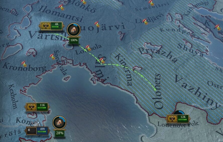 現実的で説得力のある戦争システムを構築するために、軍の移動は補給線と資源へのアクセスに依存するようになっています。軍は食料を携行しますが、最終的には友好地域から補給を受ける必要があります。これは、軍と最も近い友好地域を結ぶ線として表されます。しかし、この補給線は限界までしか延ばすことができず、すぐに敵軍によって脆弱な状態に追い込まれる可能性があります。