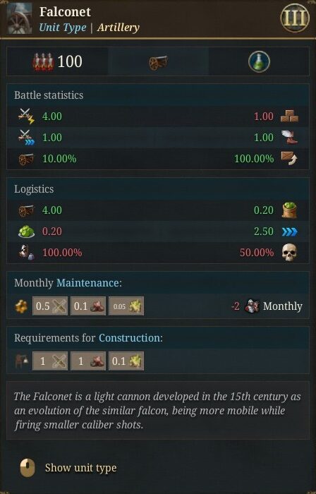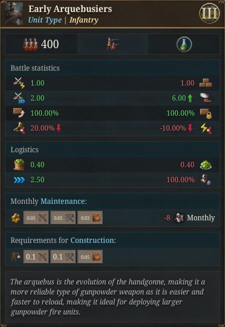 すべての常備連隊は財政的に維持しなければなりませんが、技術が進歩するにつれて訓練を行い、時間とともに強化することもできます。あなたは通常の兵士や弓兵から、ハルバード兵、銃兵、そして大砲へと移行していく過程を管理することになります。