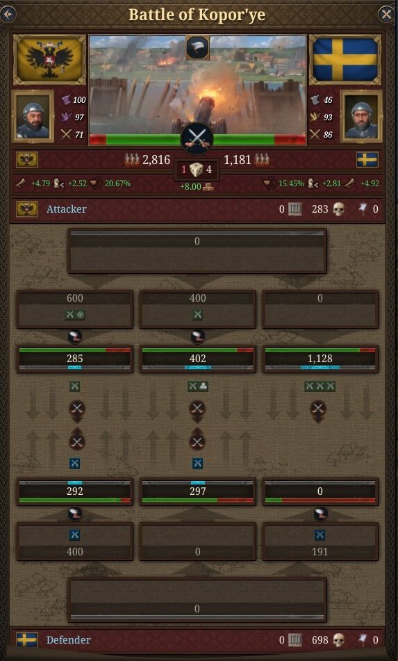 戦闘の結果は、多くの要素によって左右されます。ユニットの種類、技術水準、兵力の規模、指揮官の能力、軍の構成、地形、士気、規律、そして時には少しの運。これらすべての要素が、戦闘における勝利を確実にするために極めて重要です。