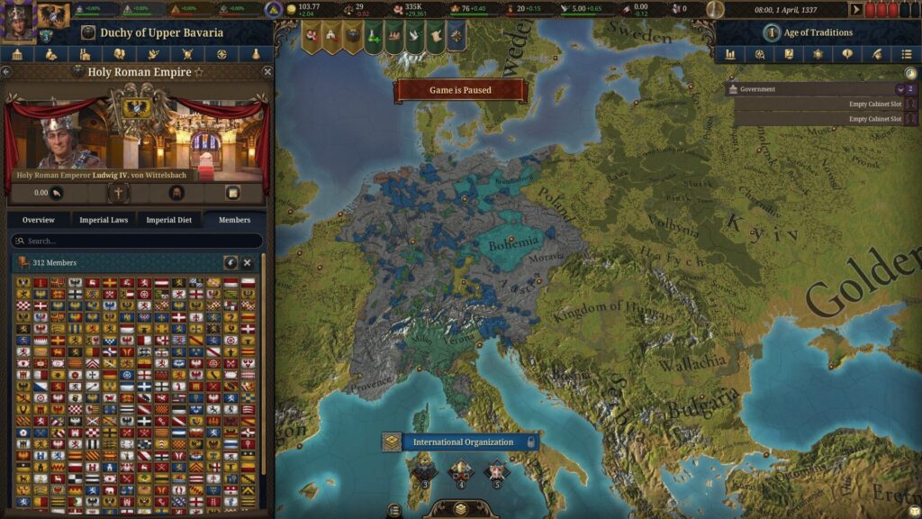 これらの国際組織の中には、加盟国全体に影響を与える法律や、組織全体のあり方を形作るゲーム上のルールを持つものもあります。たとえば、神聖ローマ帝国(HRE)には「正当な大義名分(CB)なしの戦争を禁ずる」という内部規則が存在します。
