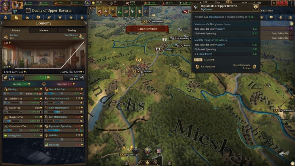 『Europa Universalis V』では、経済タブにある「外交支出(Diplomatic Spending)」スライダーを通じて、外交に直接投資することができます。