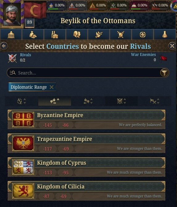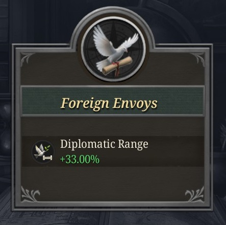 ゲームが進行するにつれて、外交範囲は技術的進歩や国家ランク(例:公国から王国への昇格)によって拡大していきます。この数値は、外交官が外交を行うために移動できる最大の物理的距離を示しており、関係する両国の首都間の距離によって算出されます。