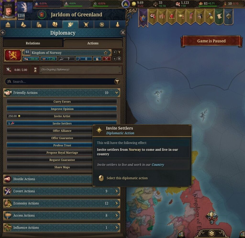 あらゆる外交行動――同盟の締結、王室間の婚姻の提案、あるいは宣戦布告であっても――には、外交官の支出が必要になります。また、「関係改善」「恩義の獲得」「諜報網の構築」といった継続的な外交行動には、毎月の外交官コストが必要になります。