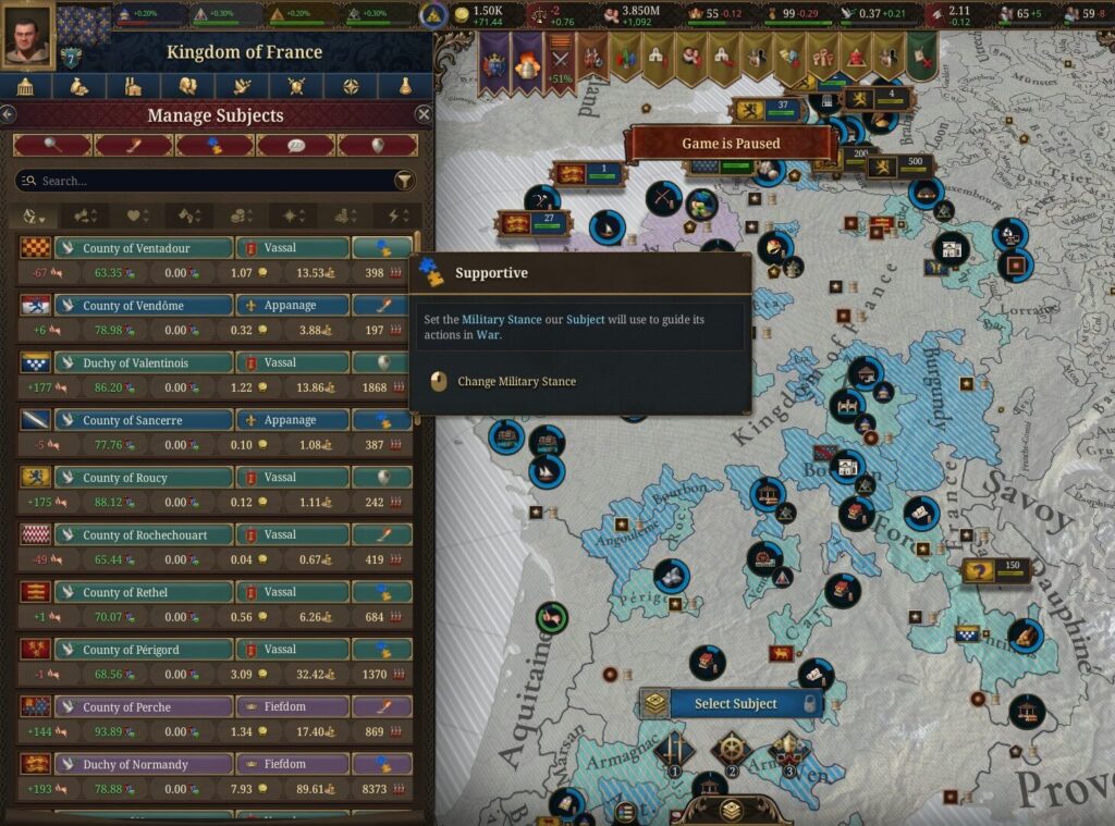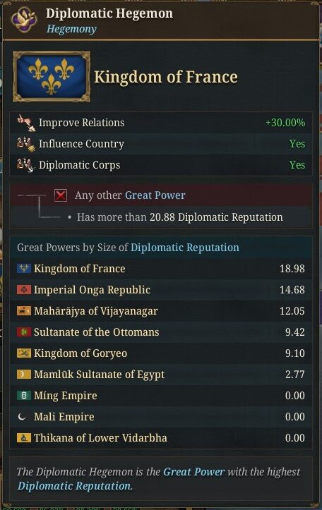 外交容量(Diplomatic Capacity)は、自国がどれほど多くの外交的約束を抱えているかを示す指標であり、国家が同時に維持できる正式な関係の数を決定します。しかし、すべての関係が同等というわけではありません。強力な同盟国や大きな属国ほど、外交容量の使用量は多くなります。フランスとの同盟は、ウルム伯国との同盟よりもはるかに高いコストがかかりますし、大規模な封臣は小規模な属国よりも多くの外交容量を必要とします。この外交容量の上限を超えることも可能ですが、その場合は属国の忠誠心、外交的評価(Diplomatic Reputation)、王権(Crown Power)などに悪影響を及ぼすことになります。