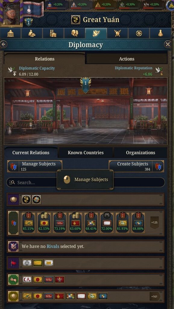 最大外交官数および新たな外交官の生成速度は、国家の格、社会的価値観、技術的進歩、外交支出、そして首都に建設する「王立庭園(Royal Garden)」の建物によって増加させることができます。