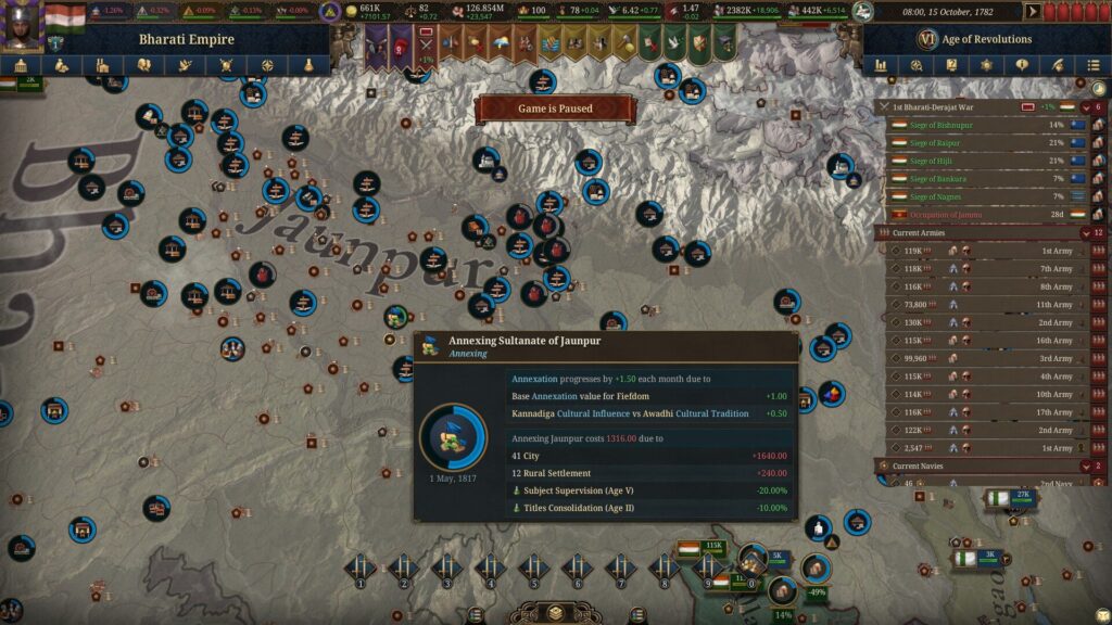 1737年の「革命の時代(Age of Revolutions)」において、「帝国主義(Imperialism)」の開戦事由(CB)が解禁されます。これにより、諜報網(Spy Network)を利用して征服戦争を引き起こすことが可能になります。この開戦事由は通常の征服CBとは異なり、戦勝点(War Score)のコストを削減する効果を持っています。そのため、単一の和平交渉で広大な領土を獲得することができるようになります。