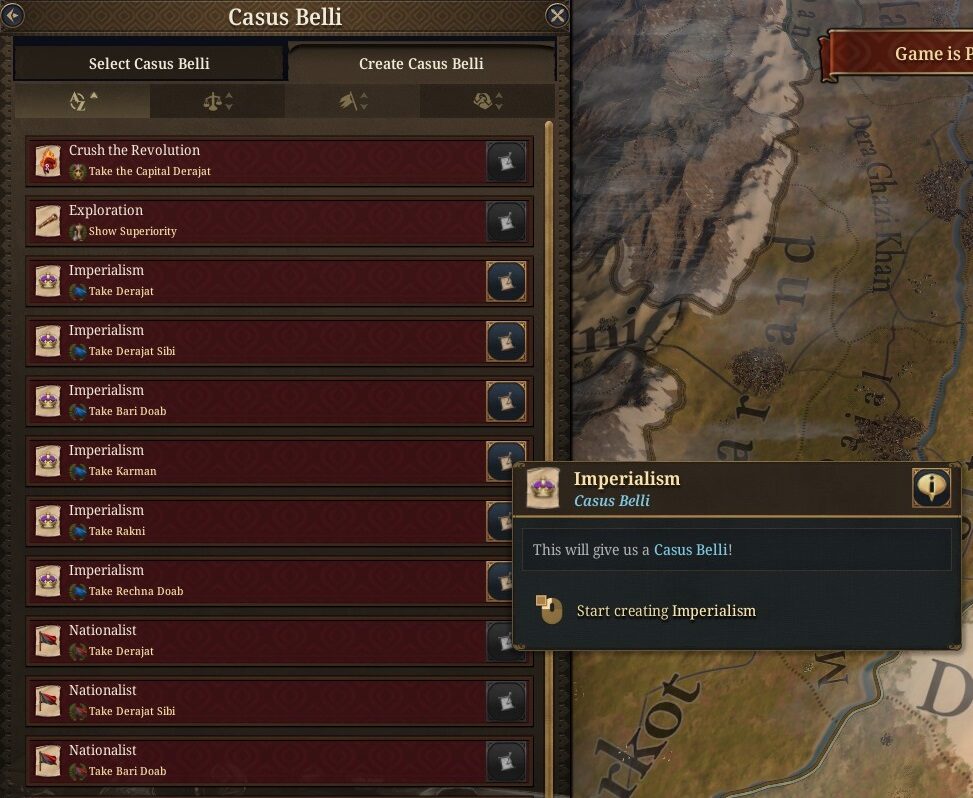 しかし、外交とは時に破綻するものです。EU5では、国に残された唯一の選択肢が「宣戦布告」である場合もあります。ここで登場するのが、「開戦事由(Casus Belli、略してCB)」を作成し、使用するという仕組みです。
