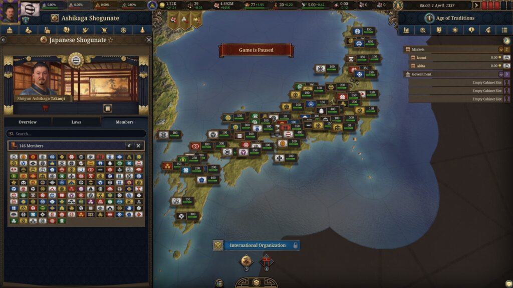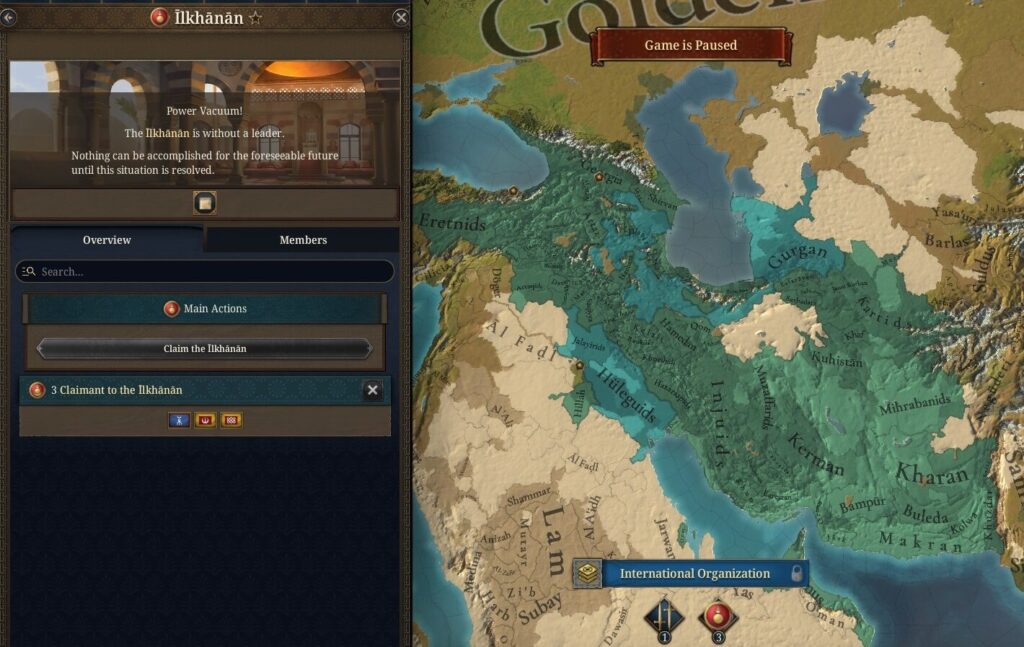 国際組織の多くには指導国が存在し、この国が法律の制定手続きを開始したり、加盟国を追放したりする権限を持っています。ただし、多くの場合、国際組織の指導者が行動を起こすためには、加盟国による投票制度や「国際組織値(International Organization Value)」、もしくはその両方による承認が必要となります。国際組織値は組織ごとに異なり、たとえば神聖ローマ帝国のような組織では、指導国の権威を表しています。一方、宗教派閥のような国際組織では、その値は組織自体の影響力を表すものとなっています。