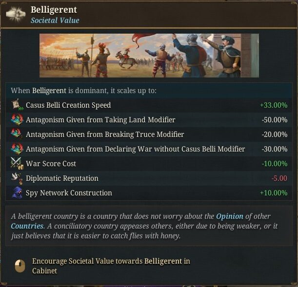 スペクトルの一方の端にある「好戦的」な国家であることは、受ける敵対心(Antagonism)を減少させ、戦勝点(warscore)のコストを低下させ、諜報網の構築速度や開戦事由(CB)の生成速度を上昇させますが、その代償として外交的評判(Diplomatic Reputation)が低下します。