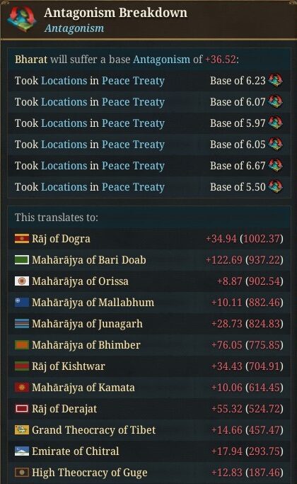 一部の行動は、特定の地域に「敵対度の爆発(Antagonism “bomb”)」を引き起こすことがあります。これは、その地域や敵対行為を行った国にどれほど関心を持っているかに応じて、周辺国に異なる程度の影響を及ぼします。敵対度の「爆発」の例としては、領土の征服、戦争による従属化、イベントの発生、捕虜の処刑などが挙げられます。